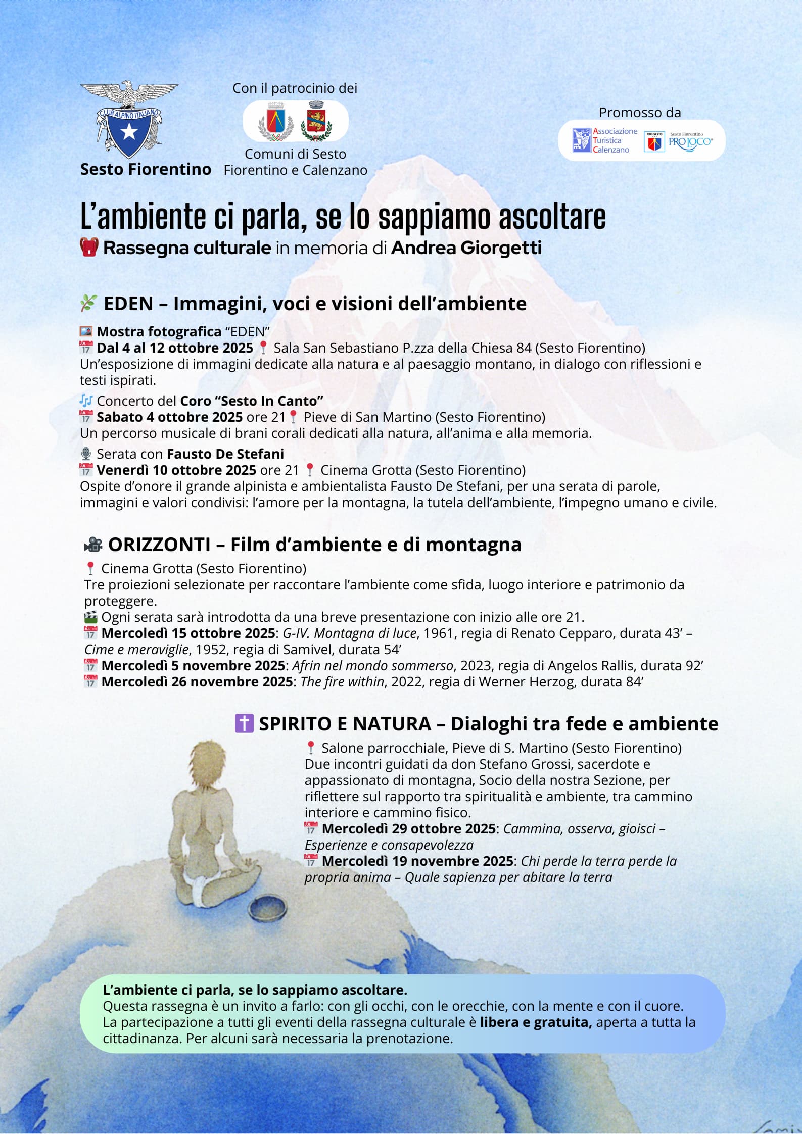 La Sezione CAI di Sesto Fiorentino presenta una rassegna culturale dedicata alla montagna e all’ambiente, in memoria di Andrea Giorgetti. Tra ottobre e novembre 2025, mostre fotografiche, concerti, proiezioni di film e incontri riflettono sulla bellezza, la spiritualità e la tutela dell’ambiente montano. Eventi gratuiti e aperti a tutti, per ascoltare e responsabilizzarsi verso la natura e noi stessi.