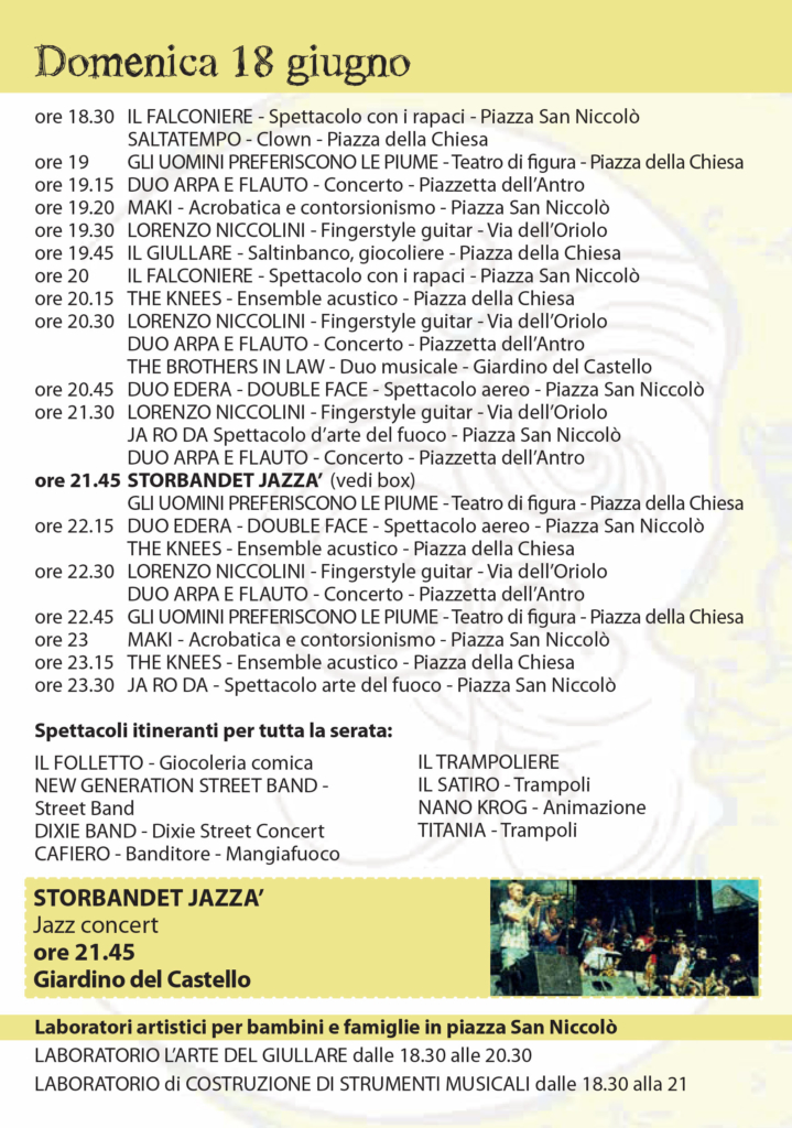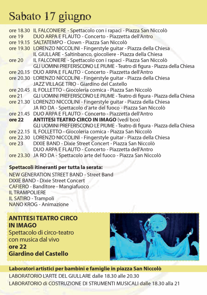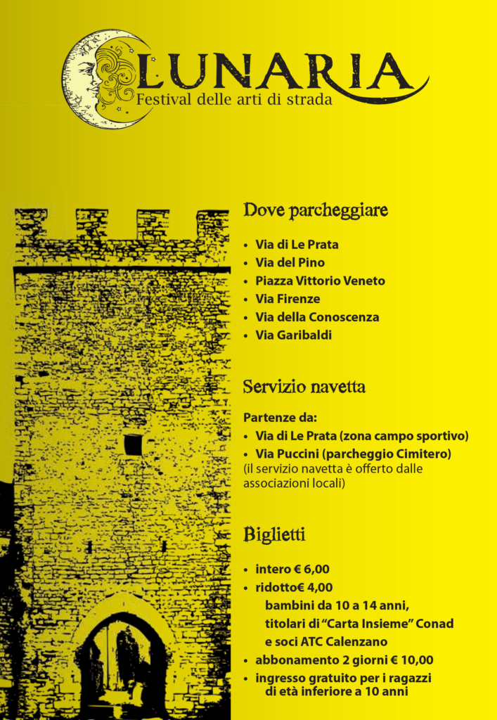 Il 17 e 18 giugno le vie del castello di Calenzano Alto saranno animate da Lunaria, festival delle arti di strada, promosso dal Comune di Calenzano e dall’Associazione Turistica Calenzano, per la direzione artistica di Stefano Gatti e direzione generale Eugenio Leone di Art Work Village.