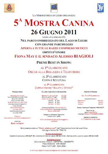 La S.V. è cortesemente invitata alla Mostra Canina che avrà luogo a Legri di Calenzano, nel parco del Lago di Legri, domenica 26 Giugno 2011. L’invito può essere esteso a tutti i Suoi amici. Arciconfraternita della Misericordia di Prato, Sezione di Legri Il Consiglio.