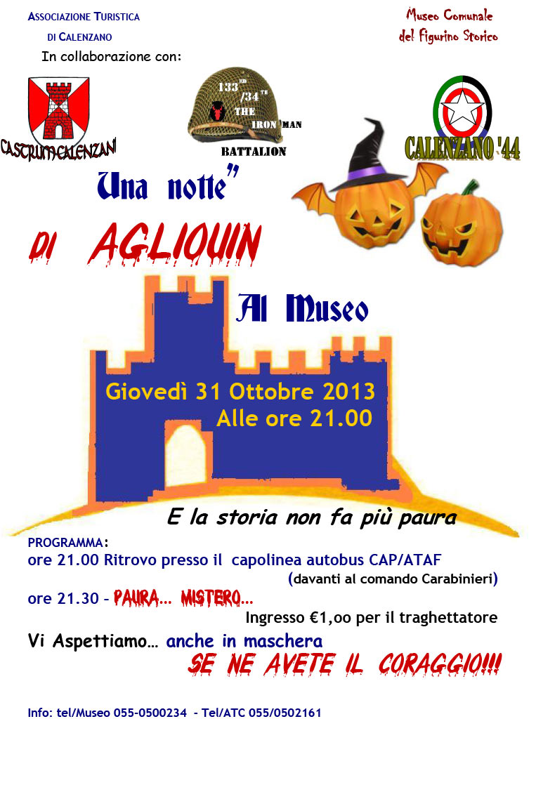 Una notte al Museo, ha visto la prima edizione nel 2012 con due eventi nel corso dell’anno ma sicuramente quello realizzato nella notte di Halloween è quello che ha elementi di maggiore fascinazione. Pur essendo una ricorrenza tipicamente statunitense, questa festa si è diffusa in tutto il mondo, nel nostro piccolo abbiamo saputo contestualizzarla e renderla anche un po’ nostra, una via di mezzo tra favola e rievocazione storica ecco perché quest’anno la denominazione diventa AglioUin, la finalità è quella di rendere fruibile il museo e il polo monumentale del Castello di Calenzano in un contesto diverso e creare attenzione sul nostro territorio.