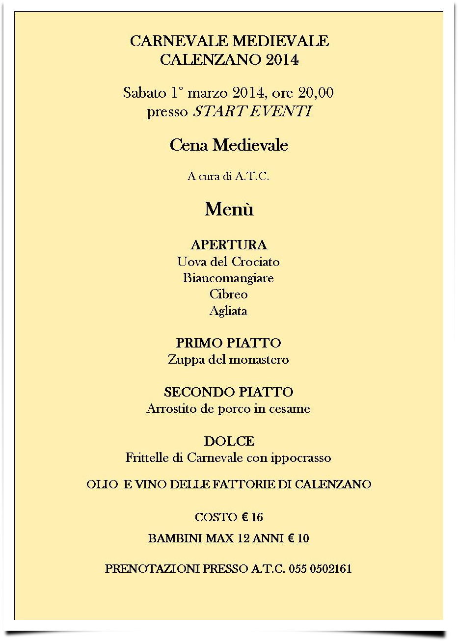 Si terrà Domenica 2 Marzo, nella splendida cornice del Castello, il carnevale Medioevale di Calenzano 2014 che quest’anno si presenta al pubblico in una veste completamente rinnovata.